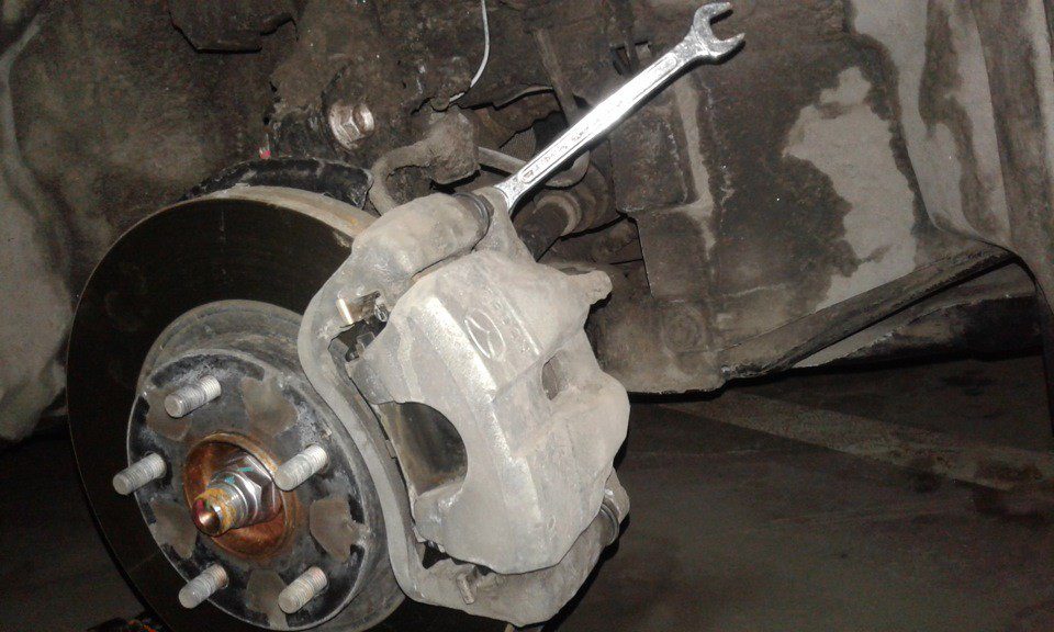 Вытаскиваем болты и вытягиваем суппорт вперед по ходу движения автомобиля: