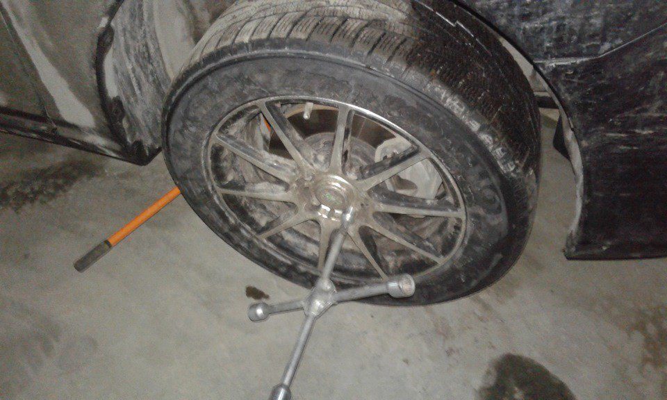 Для начала откручиваем пробку бачка тормозной жидкости и поднимаем машину и снимаем колесо: