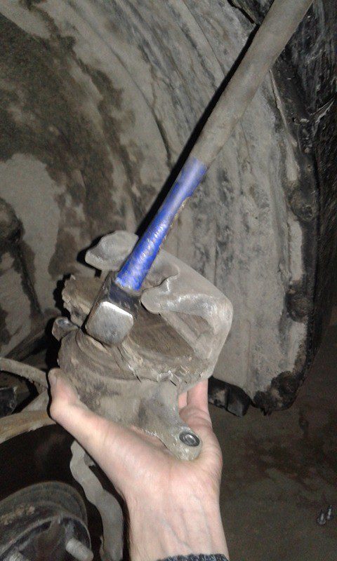 Далее необходимо утопить тормозной цилиндр в начальное положение. Для этого я использую старые колодки и молоток: