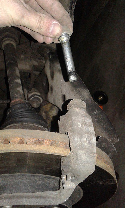Откручиваем ключом на 14 мм болт направляющей суппорта, чтобы снять сам суппорт: