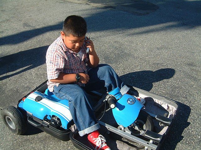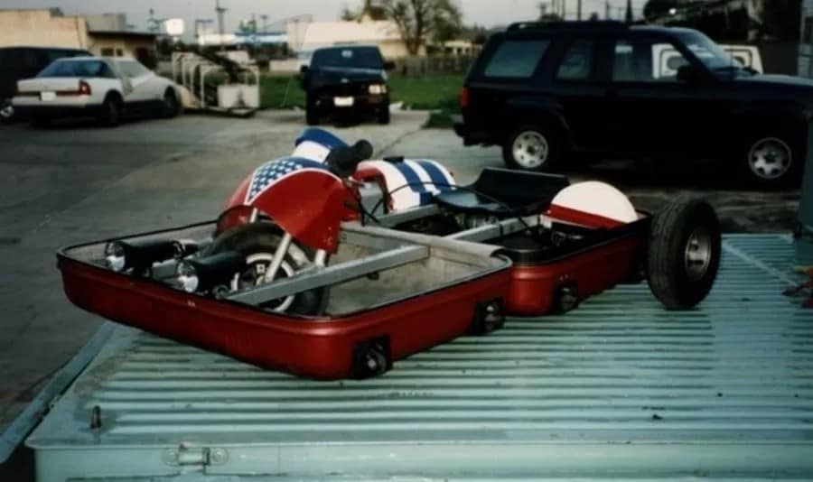 Затем в чемодан поместили двухтактный двигатель объемом 33,6 куб. См и 1,7 л.с., руль и шины диаметром 4-6 дюймов от Pocket Bike.